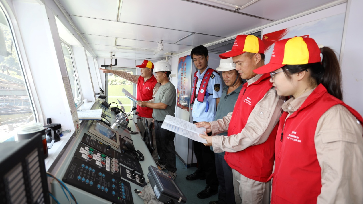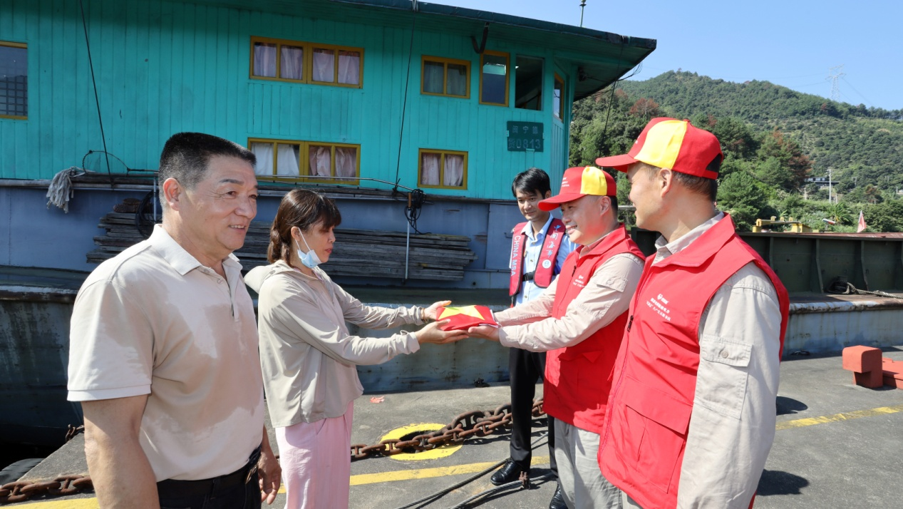 在赠旗的同时,党员服务队同步开展“水上课堂”安全宣讲。队员们登上船头,向船民发放《船舶安全航行手册》,重点讲解船舶通行水口航运枢纽的安全注意事项,以及国庆期间水口航运公司“3060”通航热线24小时值守、全程护航等服务举措。“国庆假期我们全员在岗,一定守好热线、护好航程!”党员服务队队长傅恺杰的承诺,让船民们吃了“定心丸”。