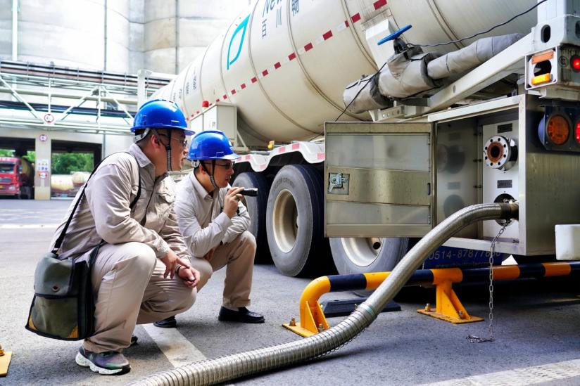 点检员正在检查移动供热车管线连接情况。