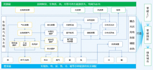 中裕智慧能源以生物质气化为主线,耦合光伏、风电、热泵、储能、余热回收等技术,实现热、电、炭、氢、冷、暖等多种能源供应及调配,打造零碳工厂、零碳园区,助力城市绿色转型。
