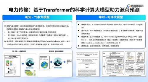 基于Transformer的科学计算大模型助力源荷预测方面,百度智能云构建了两个科学计算大模型,一个是乾知、一个是坤时。通过超分辨率技术与零样本预测能力等技术,可以助力调度工作,提升在气象、新能源、负荷侧的预测效果。