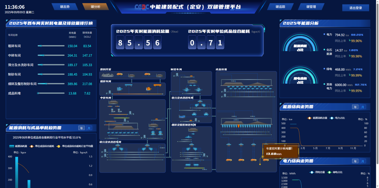 建立行业首个覆盖“开采—加工一运输一仓储”全流程的碳排放精细化管控体系。突破传统核算方法局限,开发动态核算模型,融合实测数据与机器学习算法,实现碳排放因子的实时修正;创新“监测—评估一预警—调控”闭环机制,通过物联网感知终端采集关键环节能耗数据,结合碳中和智能管控平台的可视化分析,精准定位运输、破碎等重点排放环节(占比超60%);率先发布骨料矿山碳中和标准与实施指南,填补行业空白,为同类企业提供可复制的减排路径,推动碳排放管理从“被动合规”向“主动优化”转型,助力矿山单位产能碳排放强度下降20%以上。