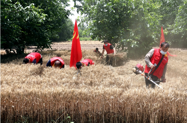 迎风飘扬的党旗与身着红马夹的共产党员服务队员成为金色麦田里一道靓丽的风景线,大家分成两组,在田间地头开展收割小麦劳动竞赛,以实际行动为群众办实事。