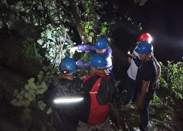 员工冒雨翻山越岭逐基杆塔进行巡视查找故障点,终于在7月4日凌晨两点零五分找到故障点,10千伏凉亭08线汤沟支线6号杆至7号杆之间因山体滑坡导致树木倾倒在线路上,供电人立即对压线树木进行清理,于7月4日两点五十三分,树木清理完毕,所有用户及台区均恢复供电。在暴雨肆虐的夜里,为两千多户居民带去了光明,是岳西电力人该有的担当。
