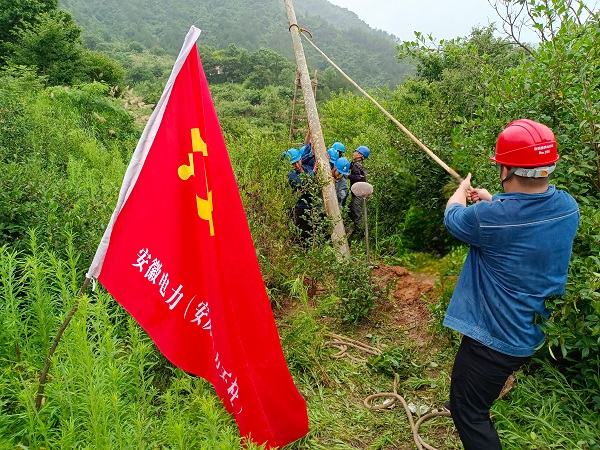 7月4日七点,店前中心供电所党员服务队早早来到抢修现场,挂接地线、挖杆洞、运电杆、人工立杆、装金具等工作有条不紊的进行着,身上分不清是雨水还是汗水,现场迎风飘扬的共产党员服务队队旗在蓝色工作服的映衬下显得格外鲜红。于当日12时完成了抢修送电,为客户送去了光明。