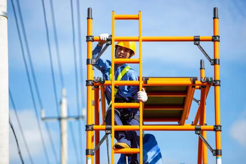 绝缘脚手架作业法是通过架设一根根绝缘固定杆构建的一个检修平台,最大作业高度12米,作业平台2*1米,能够适应狭小空间的带电作业,能够胜任常规绝缘斗臂车无法到达的场地的消缺工作。据悉,国网宁海县供电公司早在2020年就布局“全地形、全时域、全业务”不停电作业体系的建立。先后完成履带式带电作业车、绝缘平台作业法、带电作业机器人作业法等新方法的推广与应用。随着这次绝缘脚手架带电消缺的开展,国网宁海县供电公司具备了在95%以上的杆塔线路上进行不停电作业的能力,为辖区全域全面取消计划停电奠定了扎实基础。