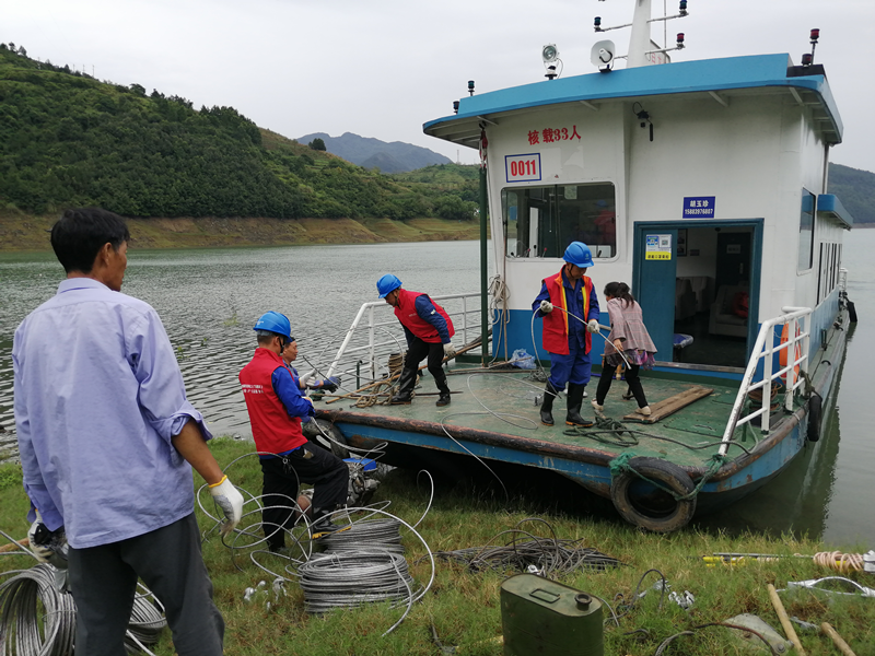 “船在水上是漂的,马力太大了船在原地打转转,只能开小马力慢慢拉” 周金文介绍,21号杆和22号杆分别在白龙湖的两岸半坡上,要重新换线,只能用船,通过“旧线拉新线”的方式完成。将旧线的一端运输到河对岸,与新线连接好,然后用绞磨机拉过河这端。由于导线很重,船只在运输过程中因动力不足,非常费时。700米宽的河道,展放线路就用了4个多小时。