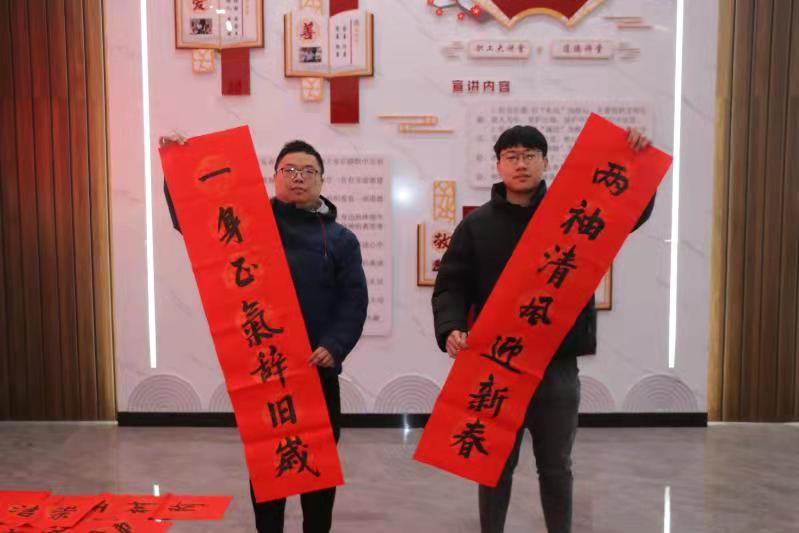 “一身正气辞旧岁,两袖清风迎新春”“大地回春山青水秀景色美,全民尚廉风清月朗风气新”“以德修身胸襟磊落与瑞雪齐霁,以廉养性心底坦荡同山川共映”“倡廉春风吹五岳红梅开盛世、正气长歌奏九洲瑞雪兆丰年”,在活动现场,该公司两位书画俱乐部成员挥斥方遒,笔力苍劲,用饱蘸热情的毛笔书写着平仄有序、对仗工整、寓意吉祥的春联,饱含了对未来公司继续蒸蒸日上、干部员工上下一心、工作氛围气正风清的美好愿景。前来领取春联和“福”字的员工络绎不绝,并主动帮忙倒墨汁、晾春联,现场墨香四溢、“清”风阵阵、热闹非凡。