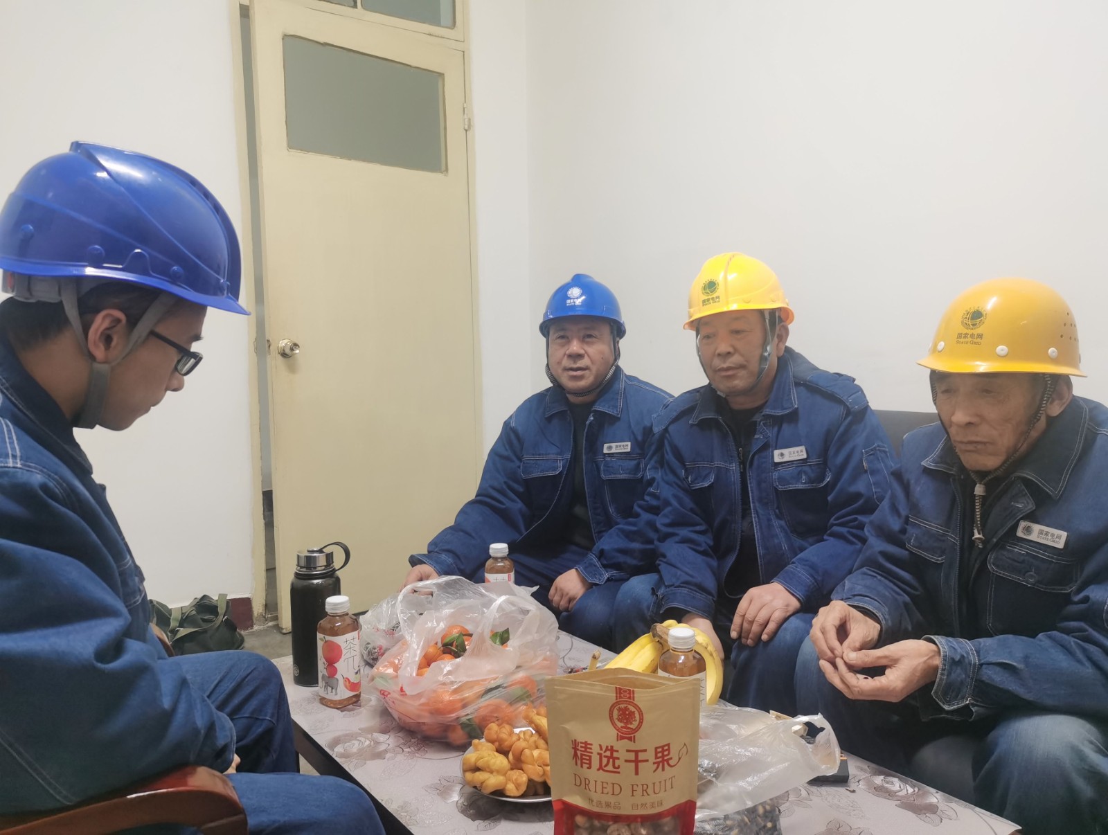 晚上20时,变电站里的茶几上已拼凑起一桌值班人员各自带的年夜饭,虽比不上外面的喧闹,但也有一种别样的温暖。值班的四人围坐在桌前,过着属于他们自己的年三十。桌上的菜色虽不是什么山珍海味,但都是大家下班在家自己动手做的“家乡味”:千层饼、麻腐包子、五佛大枣……这些好吃又方便携带的美味摆上一桌,独有一份属于供电人特别的家乡味道。