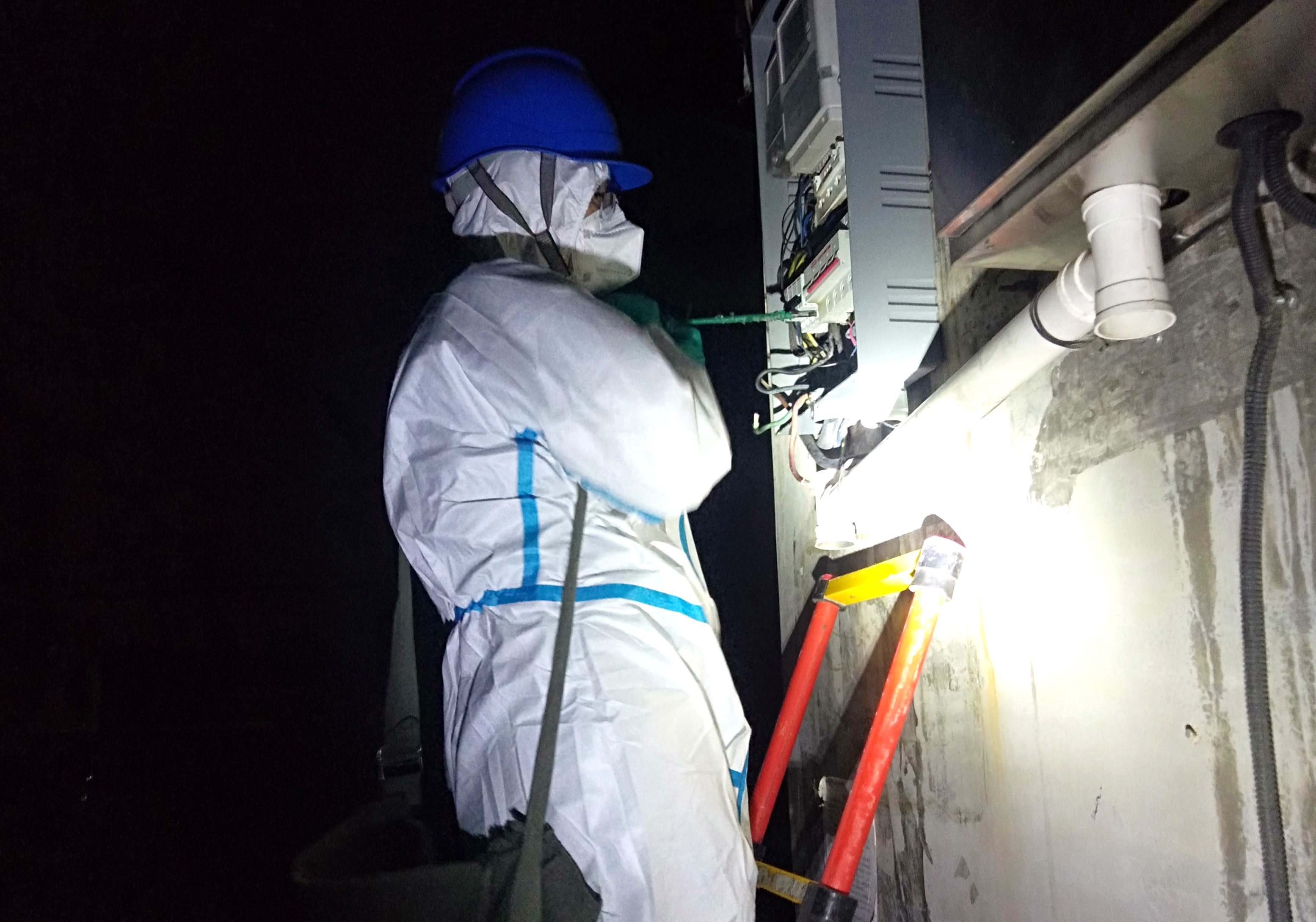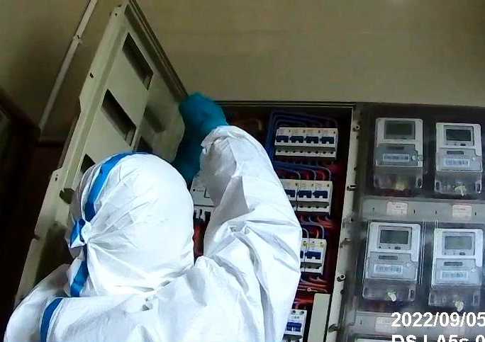 当日23点30分,柳行抢修站再次接到报修电话,柳行街道王桥村一动力表表前开关烧坏。王怀路立即与客户通过视频连线进行故障研判,发现需要临时停电进行抢修。报备后,王怀路带领抢修人员再次出发。现场抢修时,他们将抢修周围环境进行消杀,按照严密性防护要求开展抢修。虽是深夜,凉意渐浓,但穿着隔离服的他们却是满身大汗。等抢修完毕,恢复送电,已是第二天的凌晨1点。