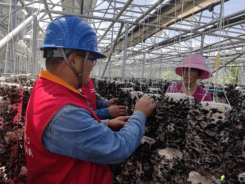 国家电网甘肃电力“连心桥”(薯都之光)共产党员服务队员在福兴德农牧林专业合作社木耳大棚