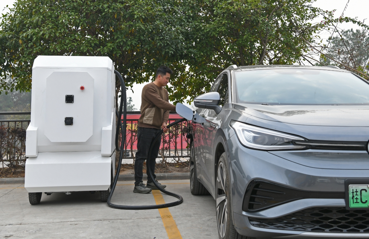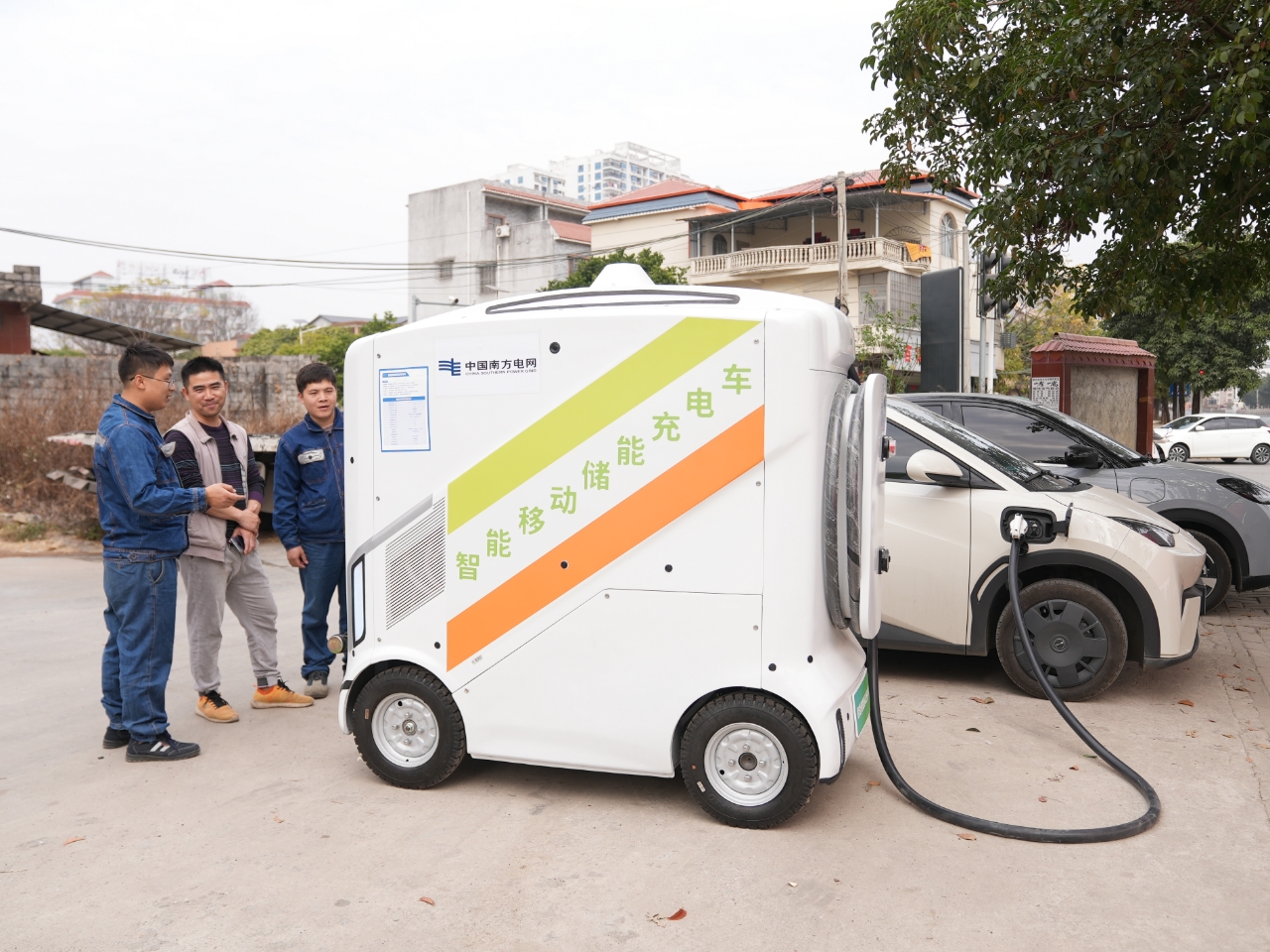 “相比传统的固定式充电桩,智能移动储能充电车有自带储能、无人驾驶、占地面积小、部署灵活便捷等优势。我们将智能移动储能充电车投放在充电桩尚未部署的村庄,为春节返乡和出行的新能源车主提供便捷的补能服务。”在现场引导的南方电网广西电动汽车服务有限公司运服部总经理助理胡弦锋介绍,南方电网投放的智能移动储能充电车电池容量达140千瓦时,充电10分钟可行驶100千米,满电状态下可为4辆新能源提供快充服务,每天满充满放能充20多辆新能源车。