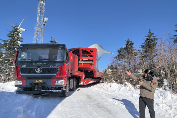 经过近二十次的模拟演练,运输方案终于尘埃落定。“路不够宽我们就修路,路滑我们就用铲车牵引开道,不能伤害树木我们就把叶片举高!”项目组成员尹立军说。在与厂家运输团队进行了充分的准备和精心部署后,1月13日清晨,装载叶片的运输队伍毅然踏上征程,开足马力向大箐山挺进。