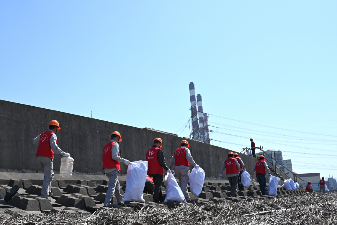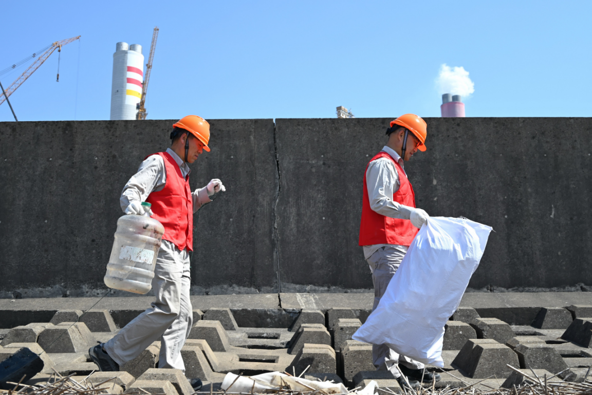 4月21日,在北仑港海岸沿线的滩涂上,身穿红马甲的国家能源集团浙江公司北仑电厂志愿者与大海相约,一场名为“清洁海洋 拥抱地球”的环保志愿活动在“浙”拉开序幕。