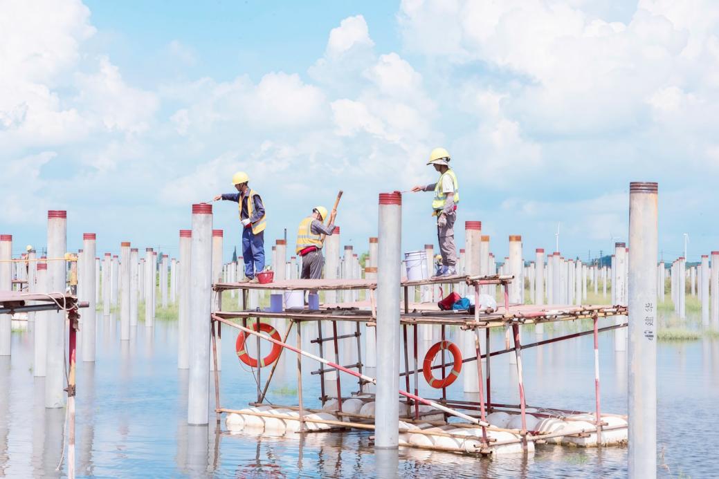 打桩组,一台台打桩机将一根根钢筋混凝土管桩扎入水底;安装组,安装着每一个支架、每一块光伏面板、拧紧每一颗螺丝;质量组,严格执行三级验收,无论是支架、组件还是线路接线,都严格自检、巡检;安全组,盯牢每一个工作面、作业点,未有半分懈怠;项目管理人员,时刻驻守现场,及时解决发现问题,以保证项目稳步有序推进。