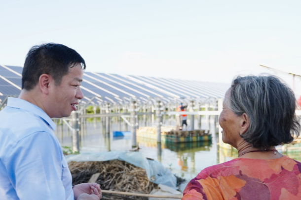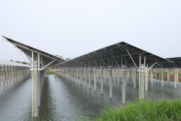 面对独特的地理条件,如何利用分散的水面开发光伏项目,实现“水上发电、水下养鱼、兼顾灌溉”的立体开发目标?该公司项目团队创造性地提出“分块发电、集中并网”的模块化设计思路,实行“一塘一方案”策略,对所有水塘进行逐一测绘和地勘,根据水塘形状进行个性化排布,将光伏组件覆盖率控制在40%以下,既能发电又不影响渔业养殖。同时,创新采用“高桩支架系统”,结合水下地形和地质条件,选用不同长度的预应力管桩,保证光伏组件距离水塘50年的最高水位1米以上,为水面养殖提供空间。通过合理布局256个分散水塘的发电单元,既保留了水面养殖、灌溉的传统功能,又构建起新型能源生产体系,实现了“一地三用”的土地综合利用模式。