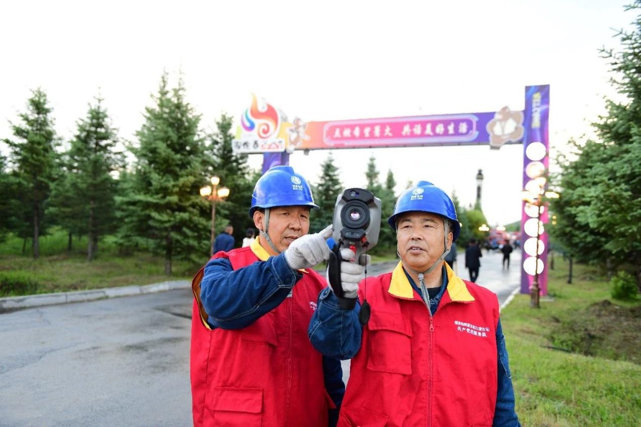 早上七点,晨光初洒甘河河畔,篝火节开幕式现场一片忙碌,一台200千瓦的发电车早已稳稳就位。保电人员迅速连接电缆、调试参数、检查电路,随着电机轰鸣启动,稳定电力即刻输出,为舞台绚丽灯光、震撼音响及各类设备“满格蓄能”,静候开幕式开启。同一时刻,保电人员两人一组,手持红外测温仪和局放检测仪,沿河岸展开高频次巡检,精准捕捉线路接头、变压器的温度变化,敏锐探测设备局部放电信号,及时预警潜在故障;确保甘河河畔电力供应安全稳定,为篝火节开幕式筑牢电力防线。