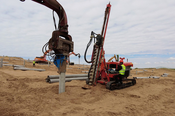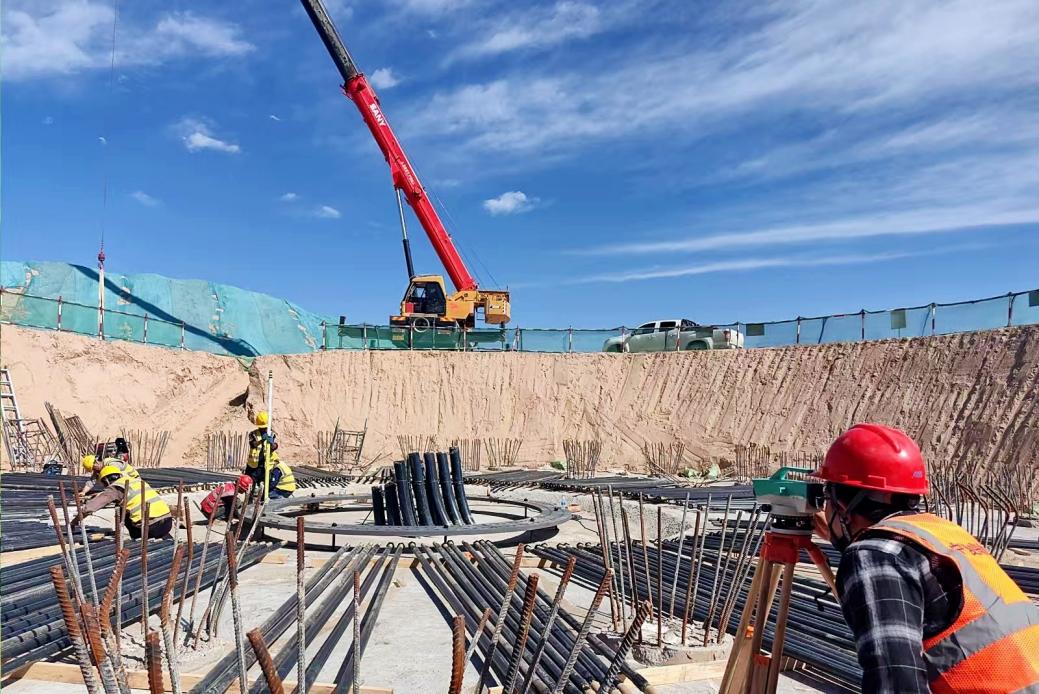 在极端环境中建设超级工程,挑战无处不在,狂暴风沙是首要敌人。项目团队以科技为盾—引入“草方格”、沙障等固沙技术,紧紧锁住流沙;优化支架设计,增强其抗风蚀能力;建立严密风沙预警机制,与自然巧妙周旋。水资源匮乏是另一道难关。团队创新应用侧引孔桩基础施工技术代替注水引孔,大幅减少施工用水;建设集雨节水灌溉系统,精准滴灌,将每一滴水的价值发挥到极致。项目经理李超翔说:“我们与风沙‘斗智’,与干旱‘较劲’,在极限条件下锻造精品工程。”