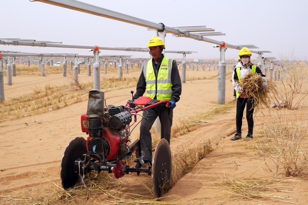 基地的绿色动能正转化为实实在在的民生红利。项目建设运营直接创造了大量就业岗位,吸引当地农牧民转型为现代产业工人。从运输到工程建设,从草方格铺设到沙生植物种植,无处不有当地居民的身影。“项目建设高峰期,有5000人同时建设。”李超翔回忆。基地还与周边村镇建立紧密帮扶机制,定向采购农副产品,援建基础设施,共享发展成果。一位参与板下种植的村民笑着说:“现在风沙小了,家门口有活干、有钱挣,幸福多了!”