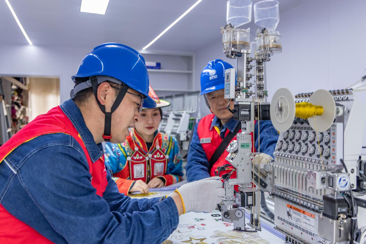 在转经轮广场,织褐子、捻线、宝敖、刺绣等原生态非遗项目吸引大量游客驻足拍照打卡,来自五湖四海的游客亲身体验裕固族服饰文化,鉴赏裕固族手工艺品,在体验过程中深入了解其背后的民族文化。随着裕固族服饰制作产业的发展,刺绣加工产业逐步电气化,该公司主动靠前服务,量身定制用电方案,优化供电线路,定期开展用电设备巡检,提供技术指导,以“零距离”服务确保生产线稳定运行,加强企业用电安全监测,为非遗技艺的现代化转型发展筑牢电力根基。