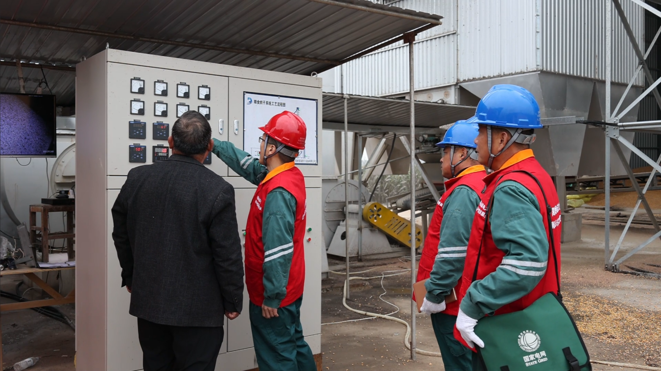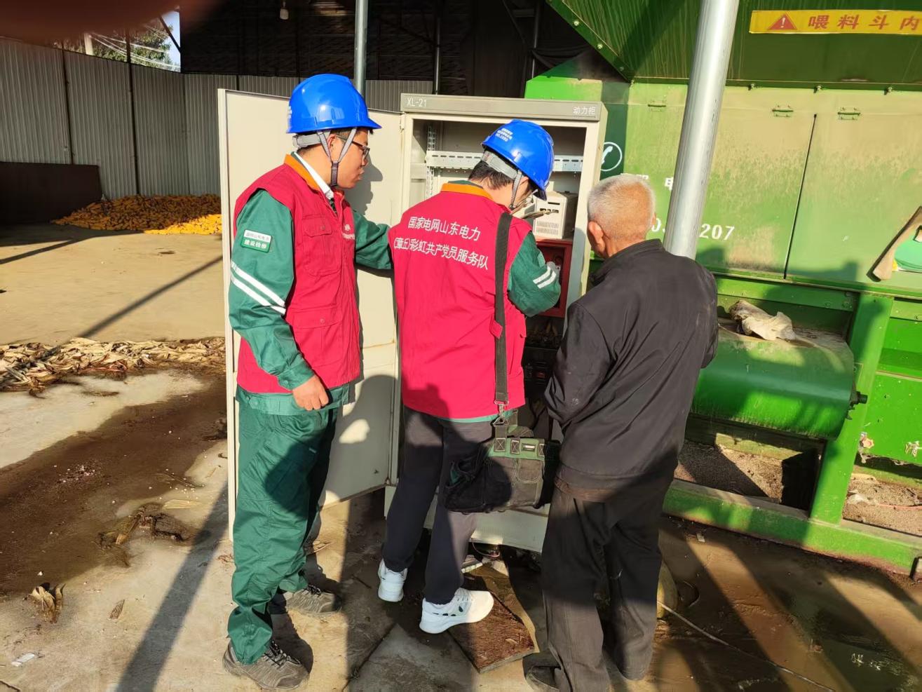 国网商河县供电公司党员服务队员正在所辖粮食烘干企业协助客户检查用电设备运行情况。