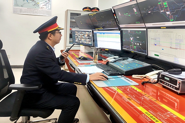 灯火通明的行车室内,气氛紧张而有序。操作台前的显示屏光影跃动,密密麻麻的列车运行数据实时刷新,红绿信号灯交替明灭,像一双双警惕的眼睛;对讲机里滋滋的电流声,更添几分肃然。车站值班员刘尚明脊背挺直,目光如炬紧盯屏幕上跃动的列车标识,指尖偶尔轻敲键盘、下达指令,循着数据轨迹精准预判每项作业环节。