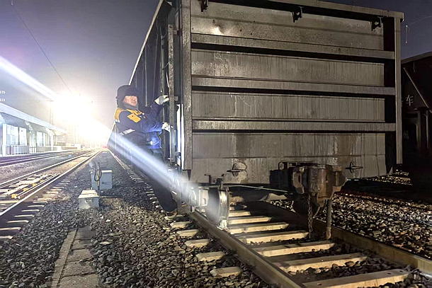 视线转向不远处的调车作业区,调车长张廷手中的无线设备闪着微光,映亮他冻得通红的脸颊。他抬手抹了把僵硬发麻的脸,掌心温度转瞬被寒风吞噬,却依旧沉稳下令:“一组负责连挂,二组检查制动软管,注意脚下碎石打滑!”话音未落,他便率先跳下车梯,厚重的棉靴踩在碎石路上咯吱作响。弓身、俯身、连挂,一气呵成,他逐节检查车厢车钩与风管的咬合间隙,确保每一个环节都安全可靠。寒风顺着衣领和袖口灌进脊背,他打了个寒战,却只顾着扯着嗓子叮嘱身边伙计:“仔细点,每一处都不能疏漏!”