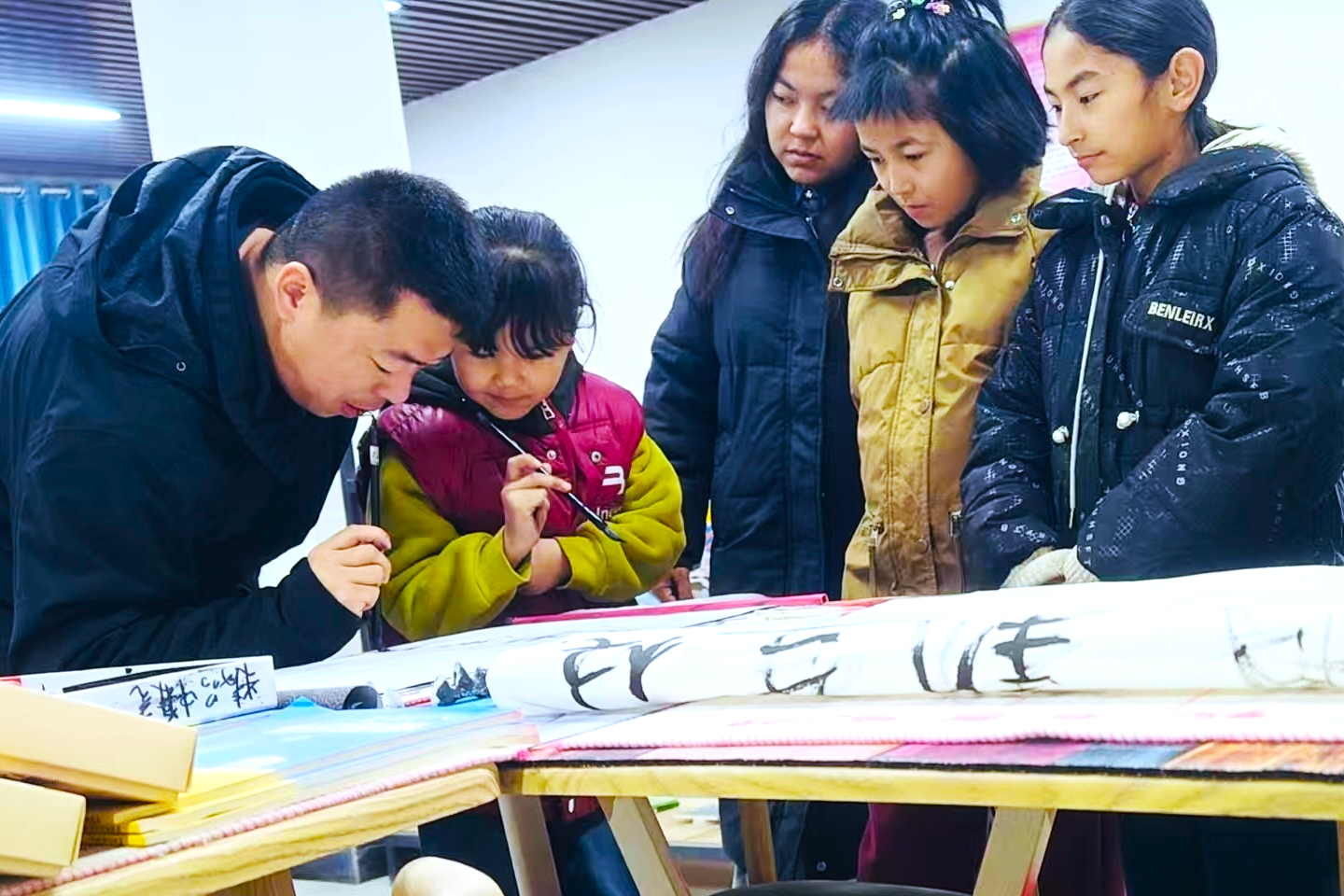 在驻村队员的悉心指导下,孩子们正专注地学习书法。