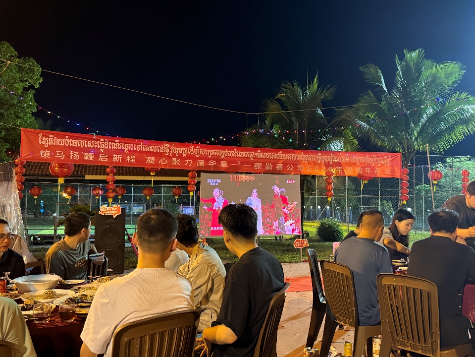 项目营地张灯结彩,火红的灯笼和喜庆的彩灯高高挂起,处处充满着喜庆的节日气氛。公司为中柬员工准备了丰盛的年夜饭。大家欢聚一堂,围坐在桌旁,品尝着兼具中柬特色的美食,欢声笑语不绝于耳,浓浓“家”的味道驱散了身在异乡的孤单。中柬员工一同收看中国中央电视台春节联欢晚会,共同感受着中华文化的独特魅力,时而为幽默的小品开怀大笑,时而为美妙的歌声鼓掌喝彩。随后的KTV环节,将气氛推向高潮,现场成为一片欢乐的海洋。