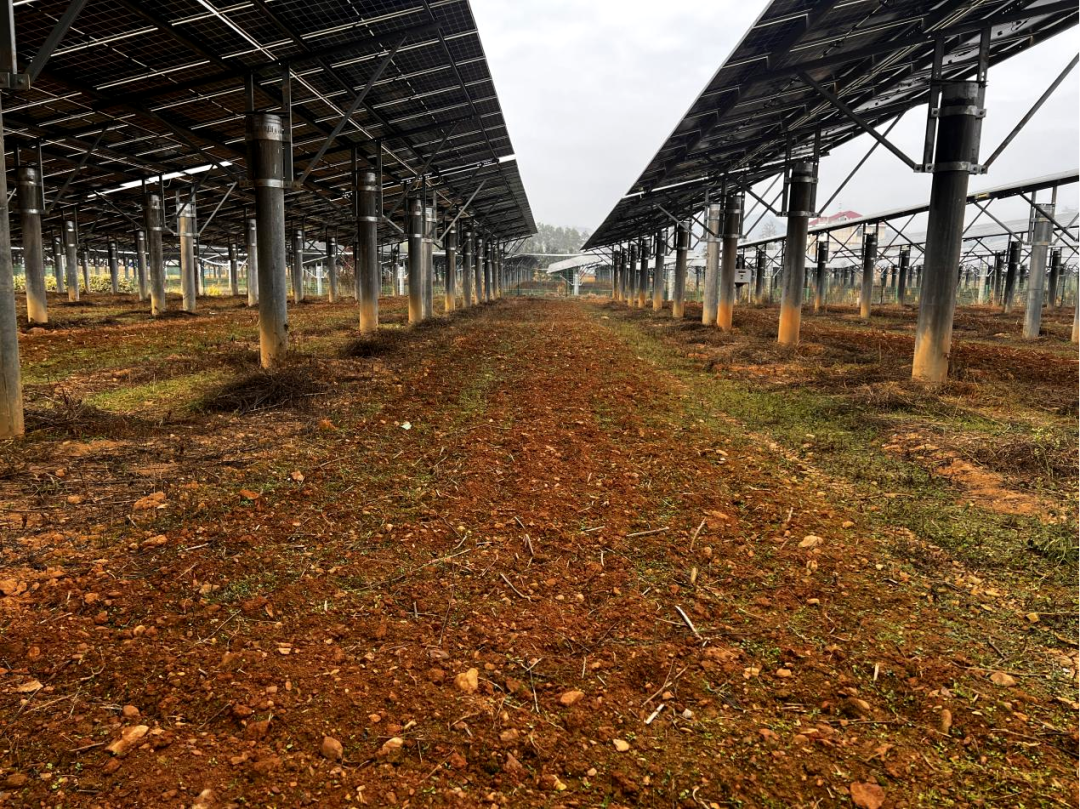 沿着田埂走进光伏板阵列间,脚下的泥土湿润松软,裹挟着雨后的清新气息,头顶的蓝色光伏板在晨光中折射出波光。不同于传统光伏电站的紧凑布局,这里的光伏板最低点距地面达2.6米,记者挺直腰杆行走无需低头避让,南北间距更是达到6.5米,小型除草机可以穿梭作业。