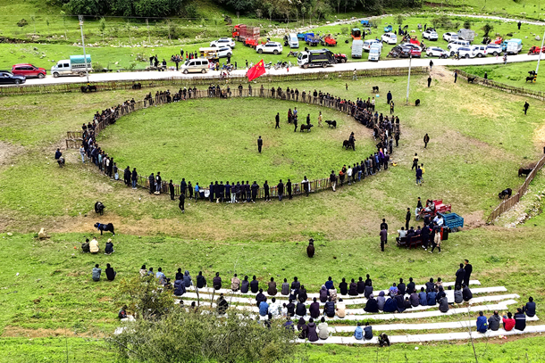 图为博作村“农文旅”融合斗羊比赛民俗文化活动现场。