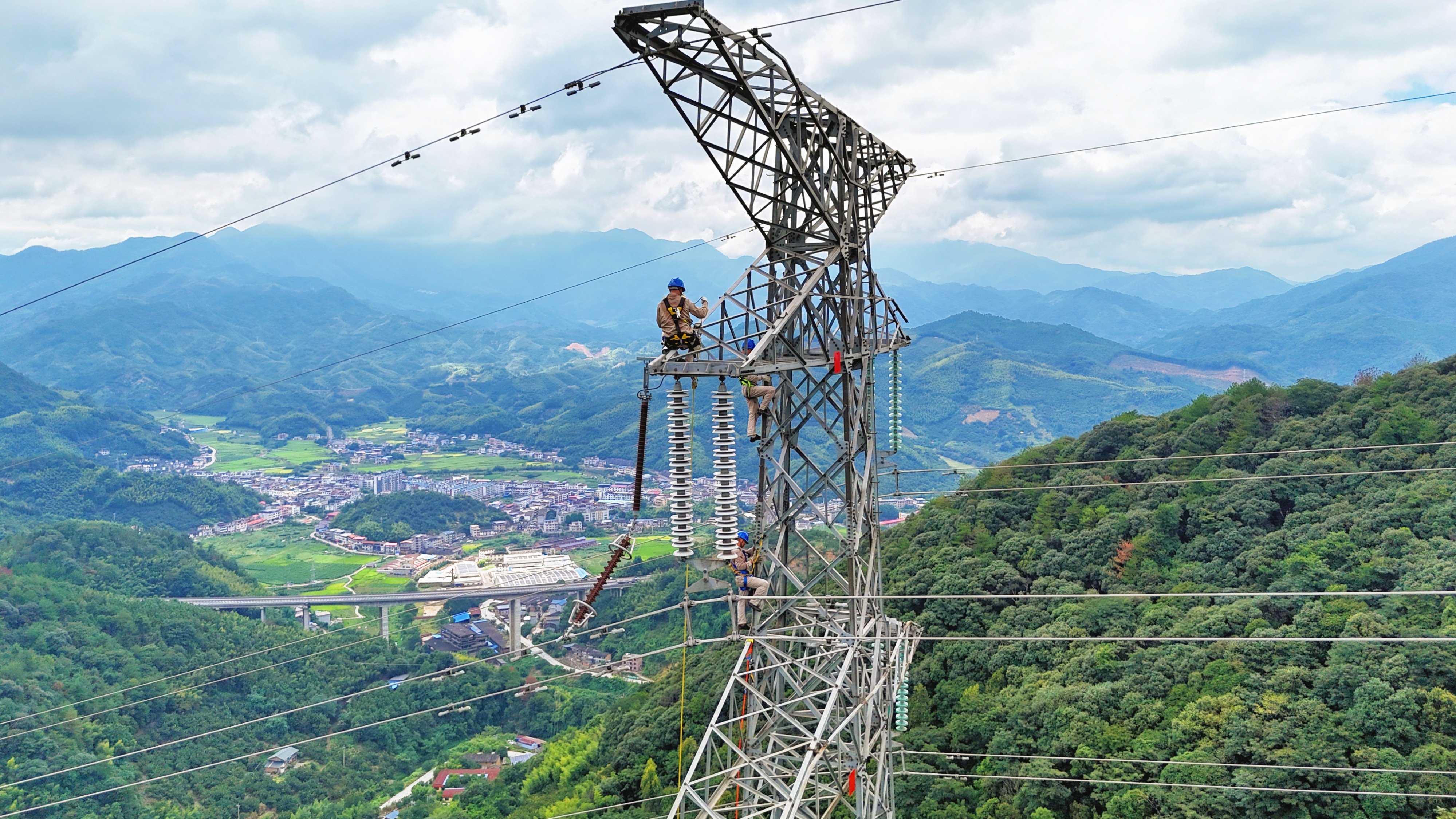 国网三明供电公司输电运检中心工作人员在220千伏兴良线#77号塔更换避雷器槽钢。(詹雪慧 摄)