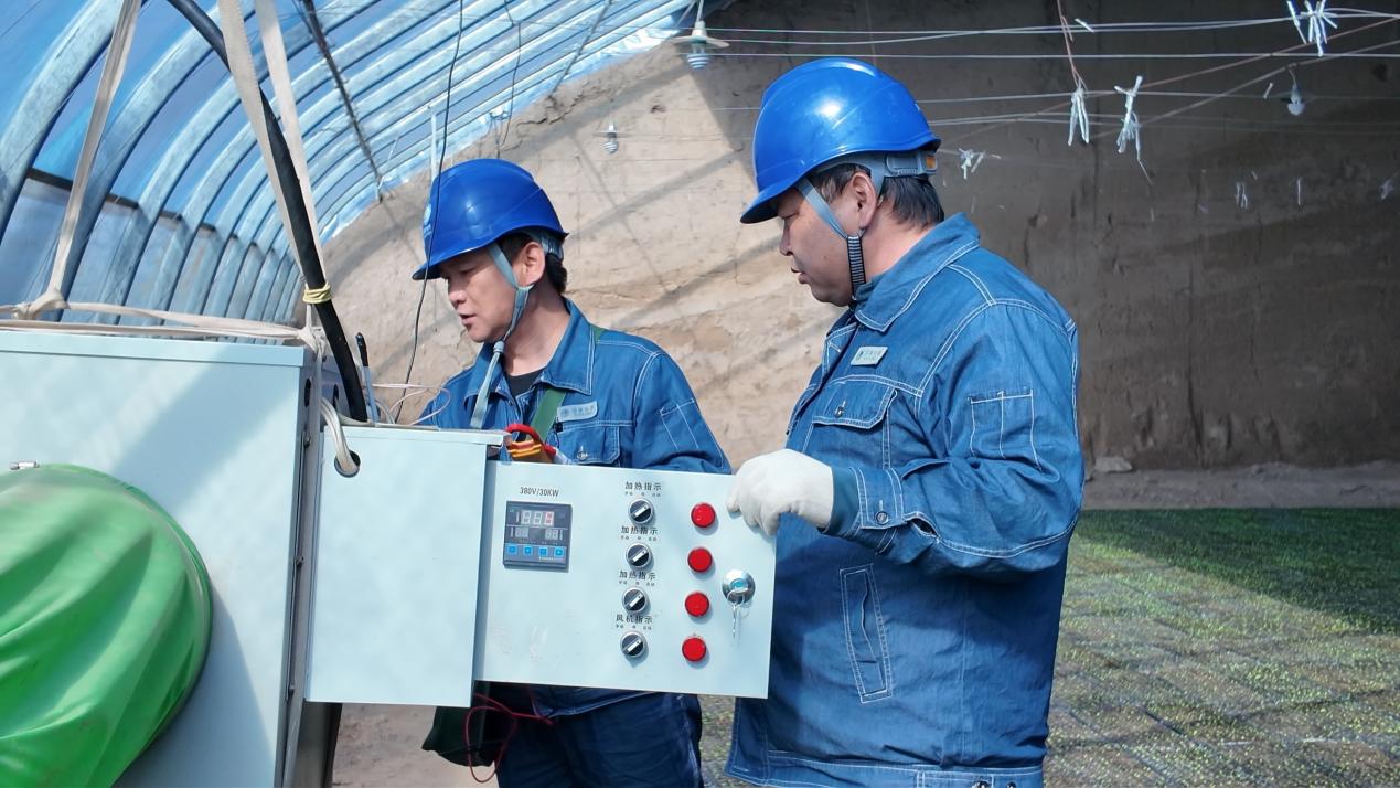 达板供电所员工祁光荣在东乡县泰安种植场给农业生产用户检查大棚暖风机。