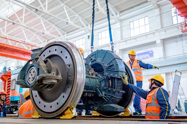 检修作业人员正在进行转向架检维修作业。