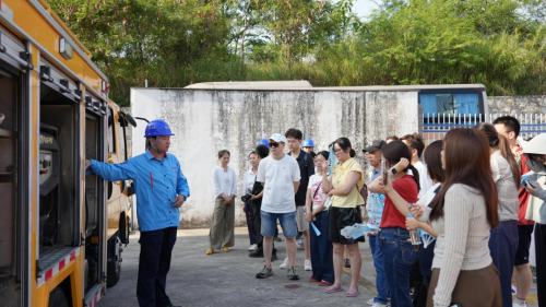 柳州中燃工作人员向媒体团介绍燃气抢修车及其抢险设备。