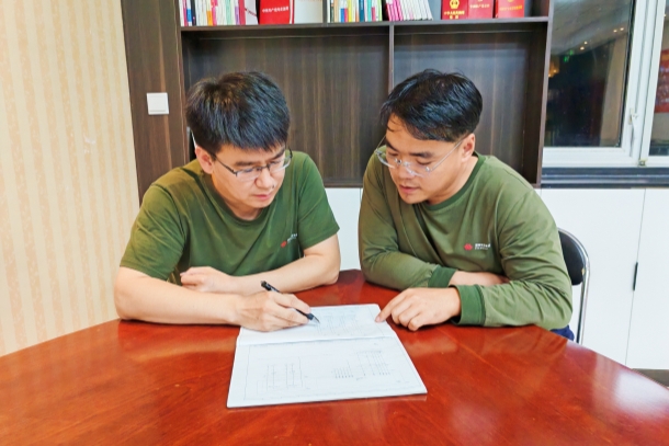 “师傅,您看这个主轴轴承温度报警,是不是测温元件的问题?”风机检修现场,新员工丁宇举着万用表,声音里带着“第一次上战场”的紧张向师傅郭明旭请教。郭明旭展开图纸,两人俯身在图纸前讨论——这是公司45对“师徒结对”的日常场景,师傅们每天都在设备旁“手把手”教徒弟们如何给设备“把脉问诊”。