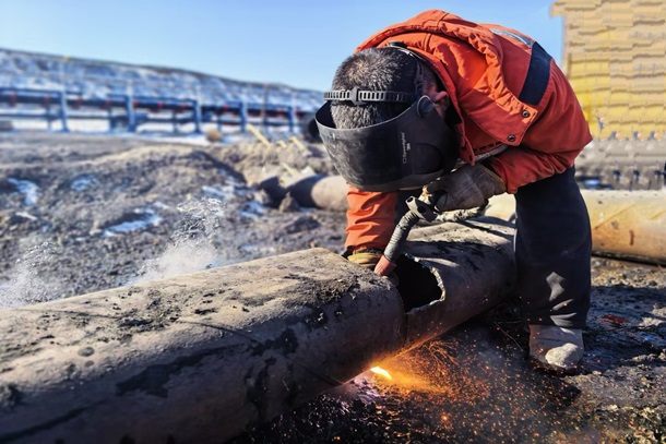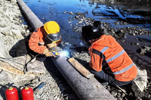 刘晓强快步冲到管路旁,借着夕阳的微光,很快就找到了漏水点。一处旧焊缝被冰碴冻胀、挤压,裂开了两指宽的大口子,冰冷的积水正从裂口处疯狂滋涌,溅得他满脸都是,工装瞬间湿了一大片。“小赵,拿焊线、调电流,快!”他一边大声呼喊,一边侧身钻进管路下方那处仅能勉强躺下的狭小空间,冰冷的地面硌着后背,积水瞬间浸透了工装。