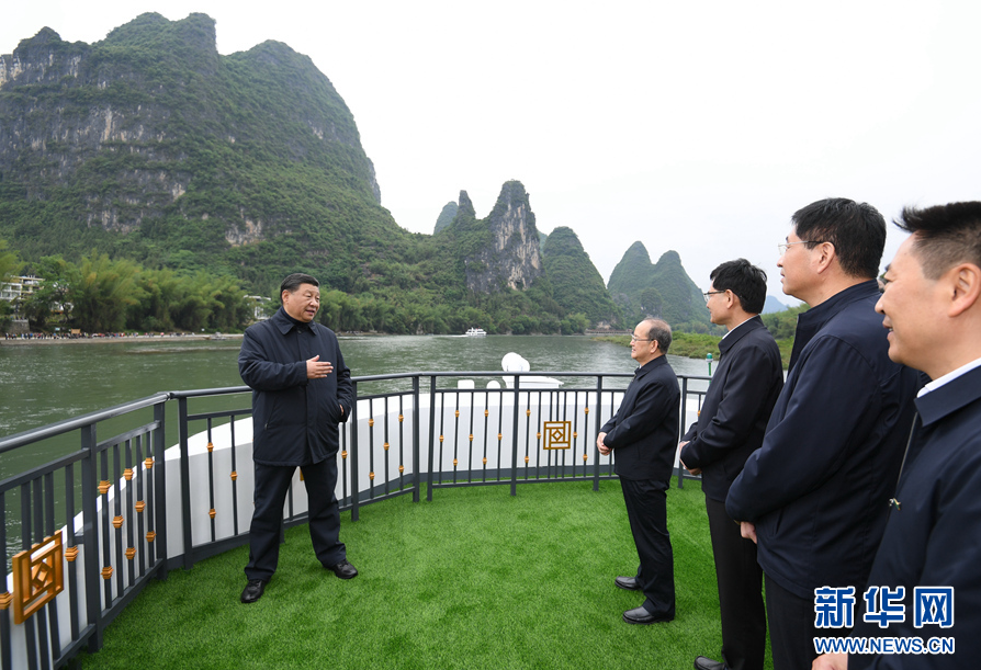 4月25日至27日,中共中央总书记、国家主席、中央军委主席习近平在广西考察。这是25日下午,习近平在桂林市阳朔县乘船考察漓江阳朔段。新华社记者 申宏 摄