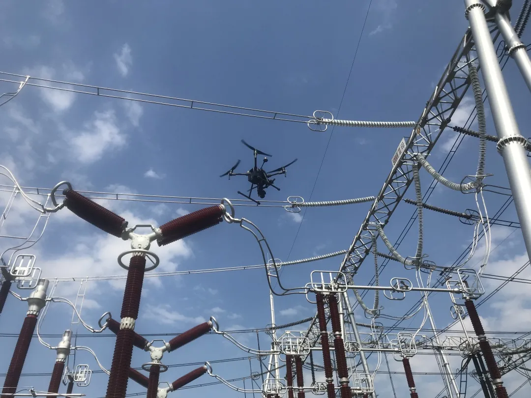 为了实时掌握主变套管及周边区域的设备温度变化,在主变压器区域安装了5台红外测温摄像头,开展不间断测温。 2019年,尖山站开始实施无人机高空一键飞巡项目。采用大疆精灵4(RTK版)无人机,通过北斗精准定位,在500千伏区域和220千伏区域设置飞巡点位1926个,对变电站构架、避雷器、互感器高层部件开展巡检,共发现CVT接线板断裂、顶部积水、严重锈蚀共计11处缺陷。
