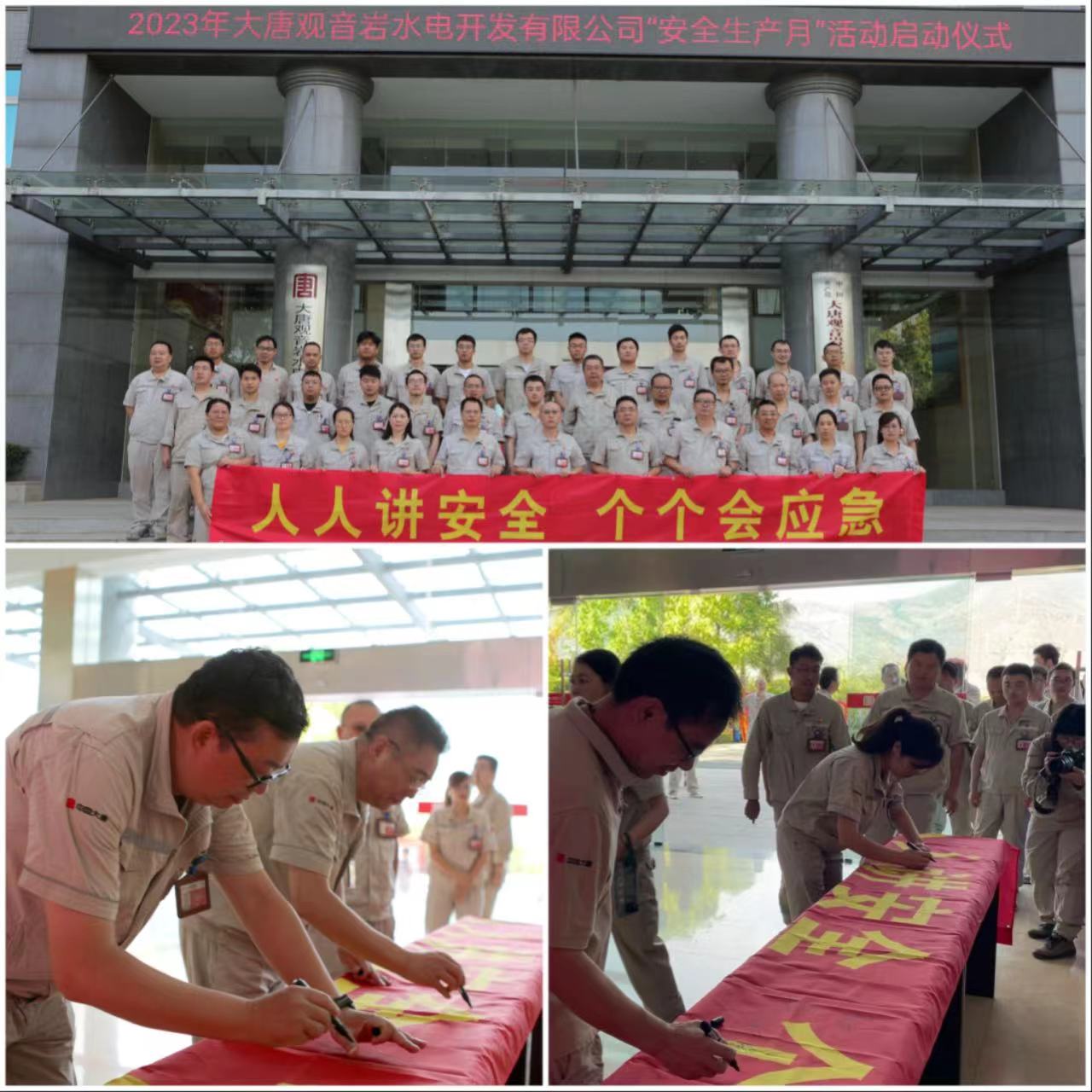 6月1日,大唐观音岩水电开发有限公司在生产现场营地办公楼举办2023年“安全生产月”启动仪式,全体员工拉起“人人讲安全,个个会应急”主题横幅,进行合影和承诺签字活动,公司董事长、党委书记席丙俊出席并宣布2023年公司“安全生产月”活动启动。公司总经理、党委副书记单云江,总会计师刘庆琦等出席仪式。