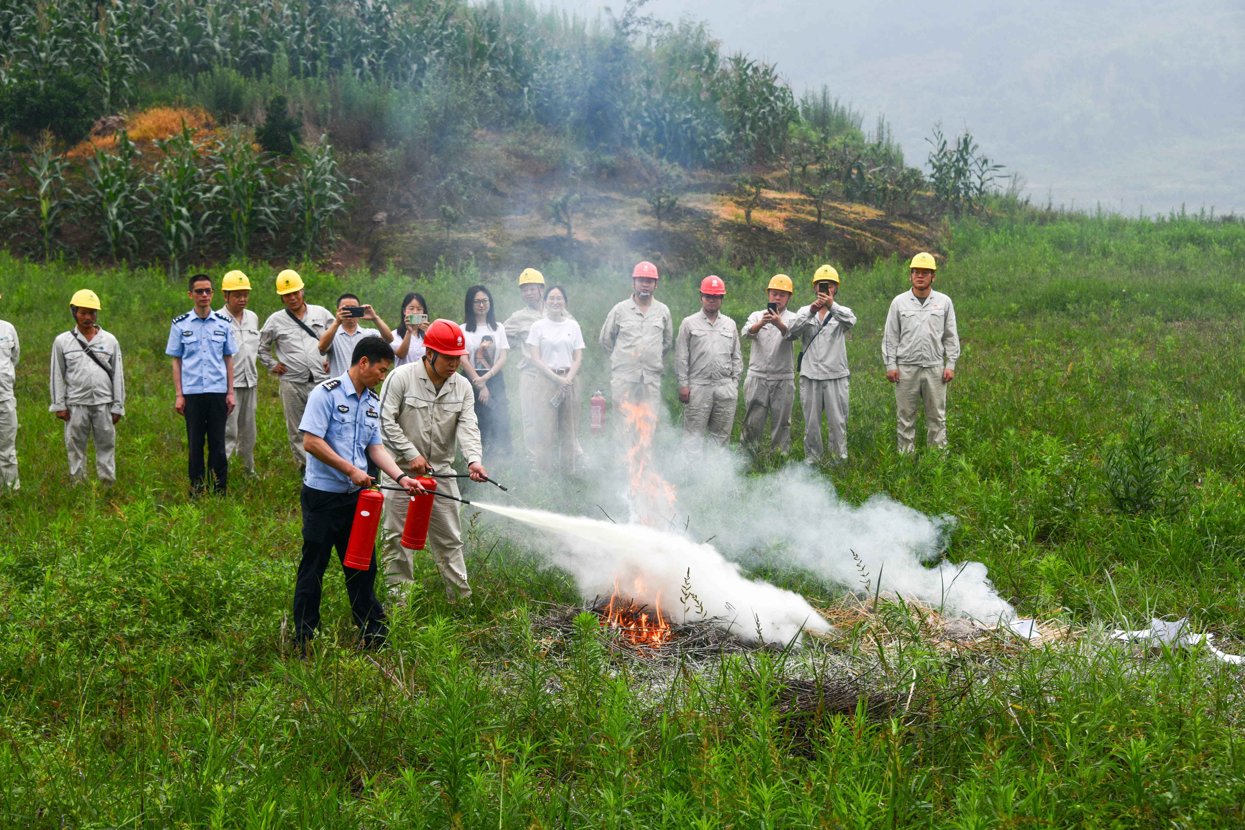 图为国网重庆江津供电公司工作人员与公安民警一起进行灭火演练。王化全 摄
