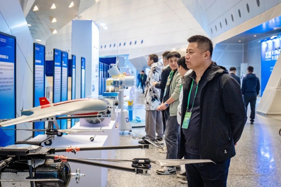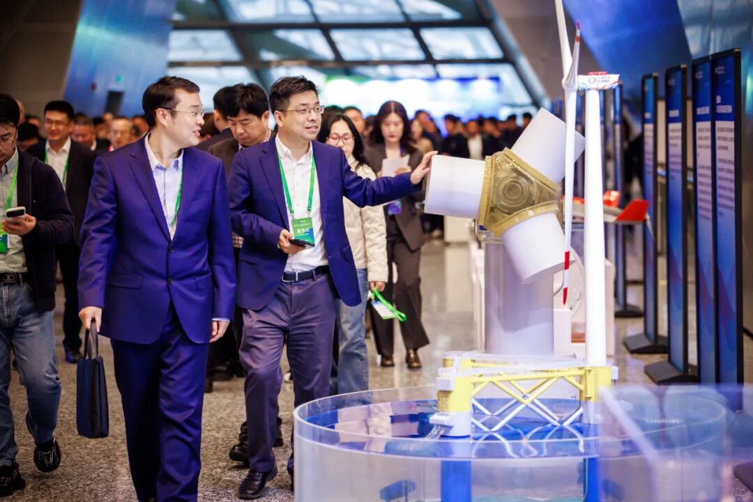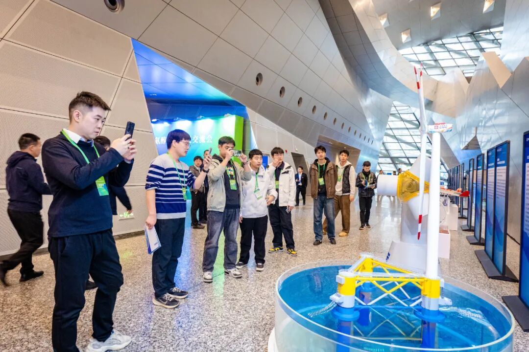 ▲ 2025海上风电现代产业链共链行动大会期间,与会人员在会场外的展台前驻足参观,大会展出的28件展品均代表了我国新能源产业领域最新技术成果。