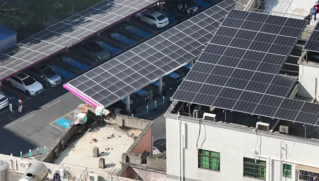 在深圳宝安区沙井街道壆岗社区的工业园内,13万多平方米屋顶光伏板连片铺展,将阳光转化为绿电;3座规划中的新能源汽车超充站已投用1座,45个充电车位在夜间迎来充电高峰。